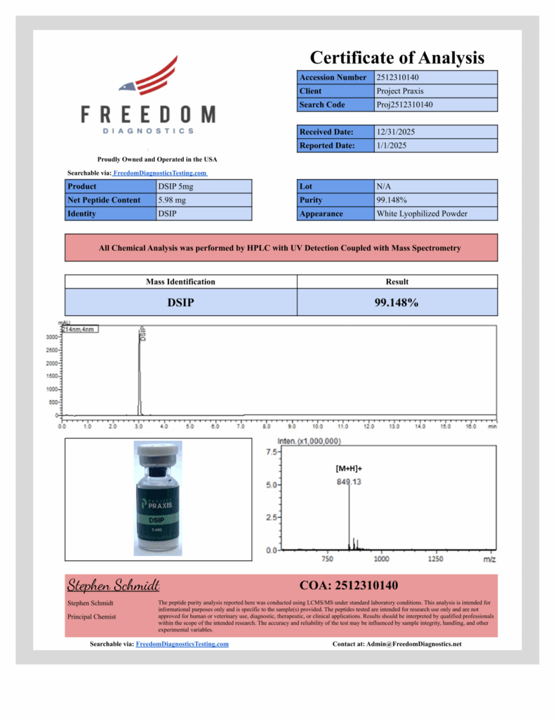 DSIP (Delta Sleep-Inducing Peptide) is a neuropeptide. Praxis provides DSIP with uncompromising accuracy, supporting research that demands clarity and rigor.